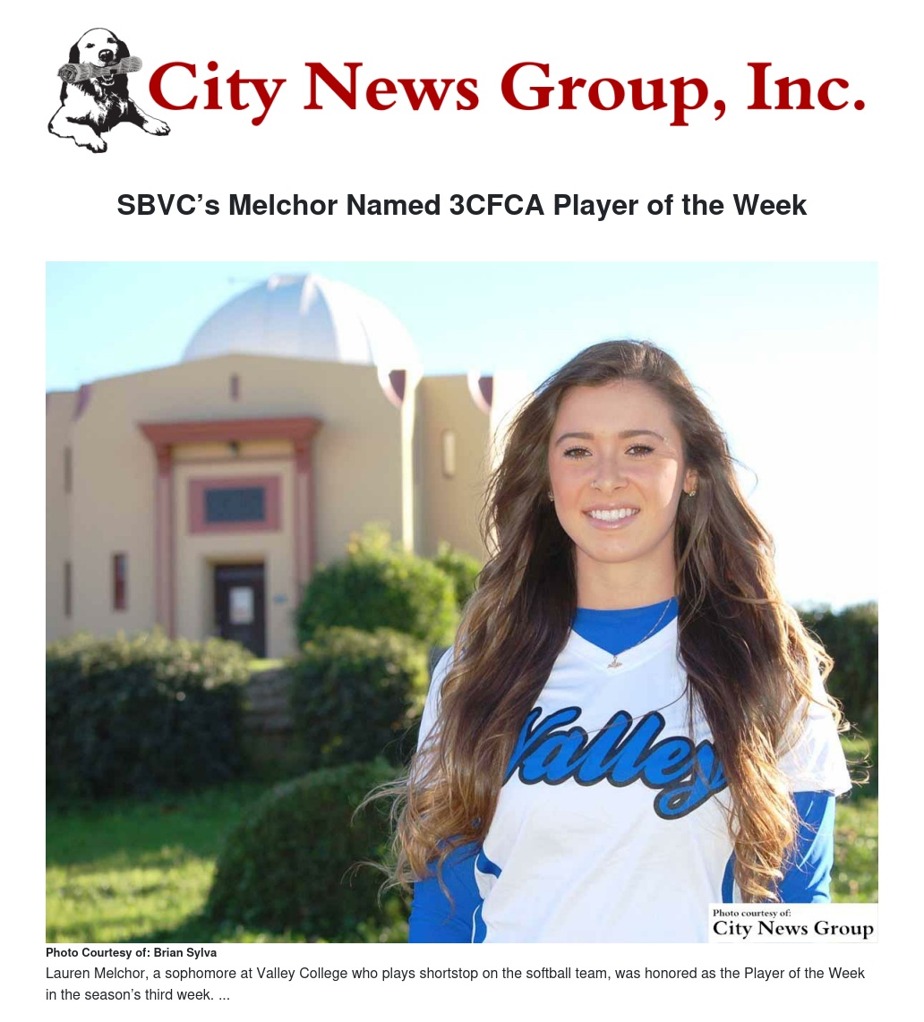 San Bernardino Valley College softball player, sophomore shortstop Lauren Melchor (Redlands East Valley) was named the California Community College Fastpitch Coaches Association (3CFCA) Week 3 Player of the Week.