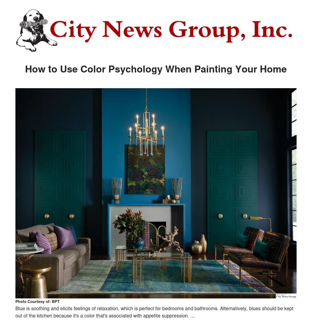 Blue is soothing and elicits feelings of relaxation, which is perfect for bedrooms and bathrooms. Alternatively, blues should be kept out of the kitchen because it's a color that's associated with appetite suppression.