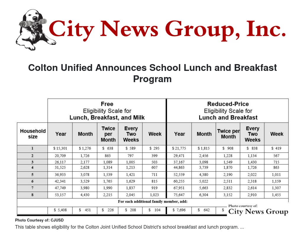 Colton Joint Unified School District announced that it will provide free and reduced-price meals for children who qualify under the National School Lunch Program and School Breakfast Program for the 2015-16 school year.