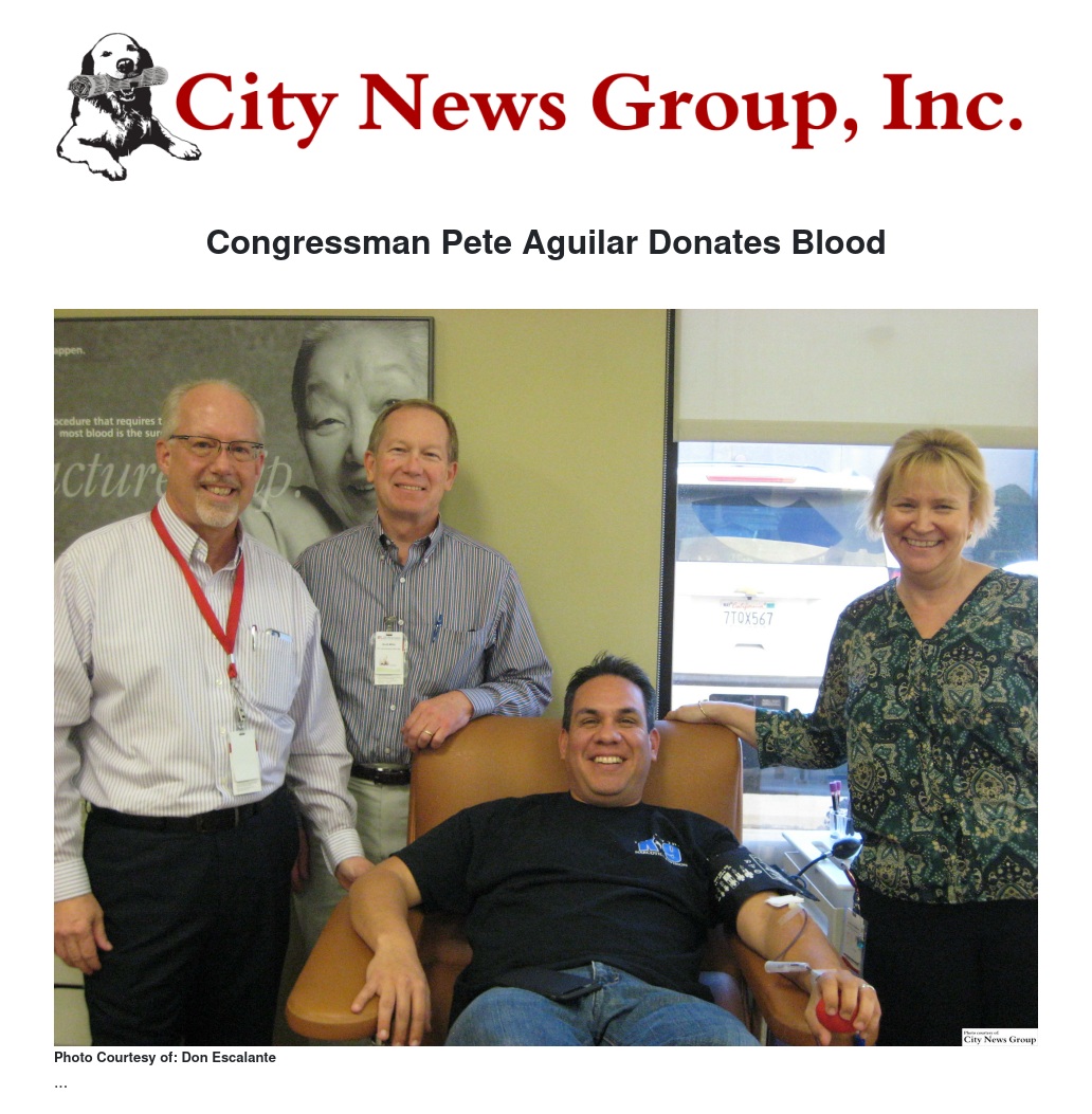 Rep. Pete Aguilar spent a portion of the Martin Luther King Jr. holiday Monday, Jan. 16 donating blood at LifeStream blood bank in San Bernardino. Pictured with the congressman are (from left) LifeStream vice presidents Kevin Moore, manufacturing and laboratory services; Scott Miller, administrative services; and Julianna Quarles, donor operations and training. Photo courtesy of: Don Escalante