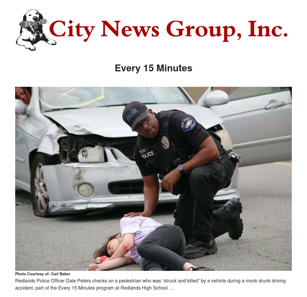 “Every 15 Minutes” was sponsored through a grant from the California Office of Traffic Safety and the California Highway Patrol. In addition to the Redlands Police and Fire Departments, partners included numerous local businesses and organizations.