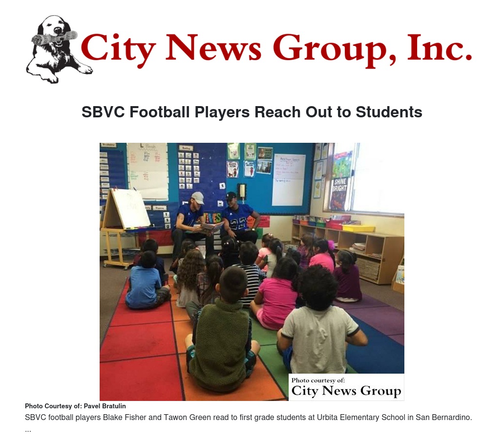 SAN BERNARDINO>> San Bernardino Valley College’s football coaches have a tradition: every semester, they take the team on community outreach visits to local schools, where the players read to students and share their experiences as college students.
