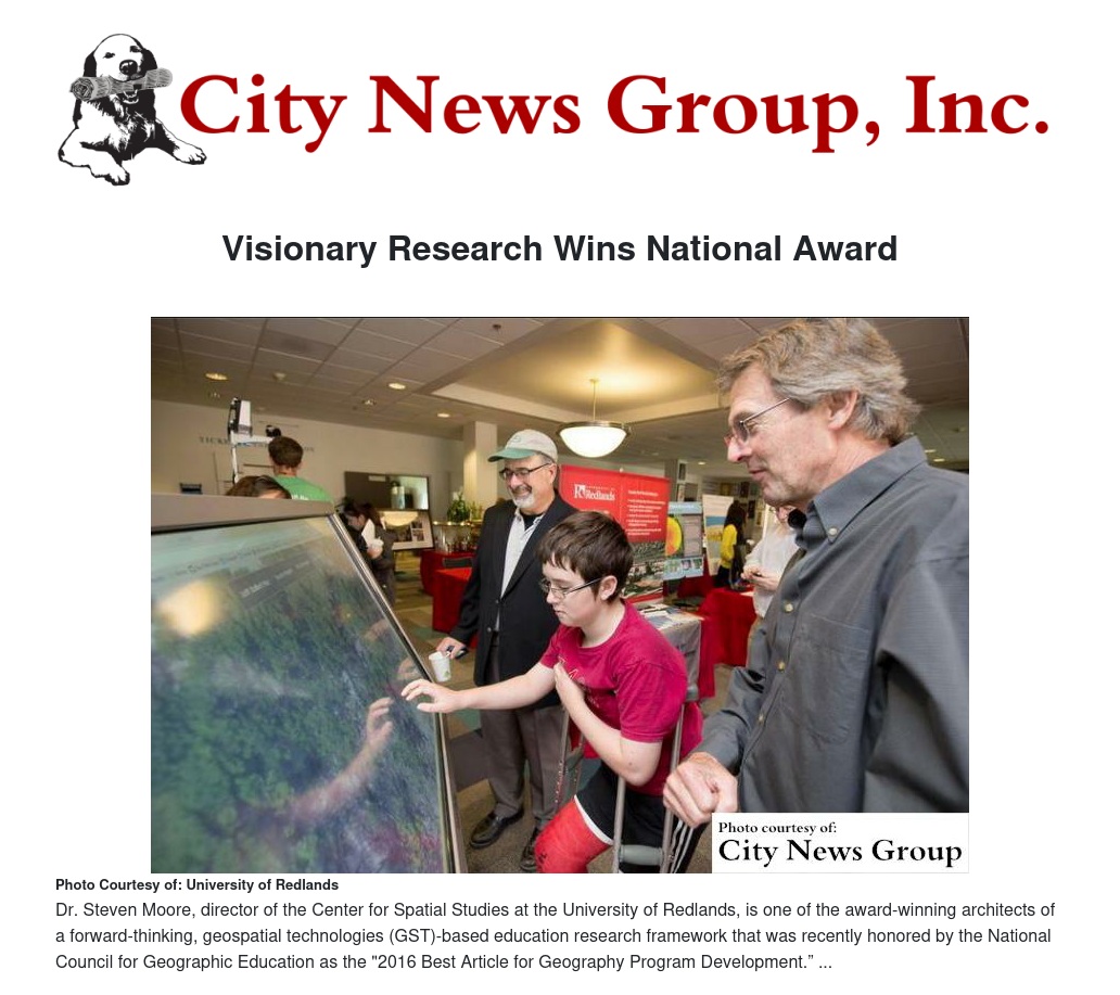 REDLANDS >> A roadmap for addressing a knowledge gap around geospatial technologies (GST) and learning has been created thanks to the collaborative and now award-winning work of a group of researchers and educators from across the nation, including University of Redlands Center for Spatial Studies Director Dr. Steven Moore.