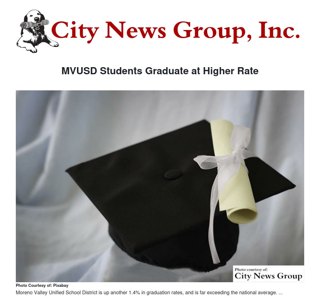 MORENO VALLEY>> Continuing a steady six-year trend, Moreno Valley Unified School District's graduation rate has increased yet again, climbing another 1.4% to 87.6%. The increase keeps the district’s graduation rate well ahead of both the state and national rate of 83.2%. The new state results show a 21.9% increase in MVUSD’s graduation rate since 2010.