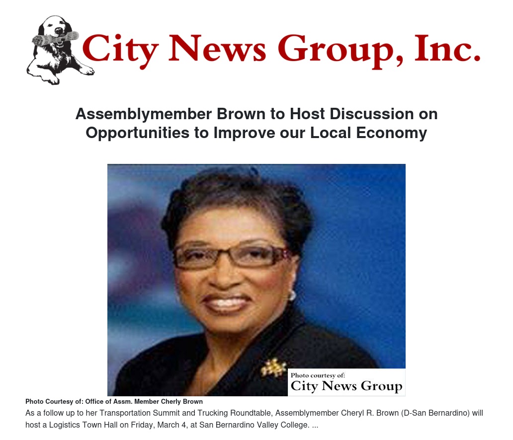 As a follow up to her Transportation Summit and Trucking Roundtable, Assemblymember Cheryl R. Brown (D-San Bernardino) will host a Logistics Town Hall on Friday, March 4, at San Bernardino Valley College.