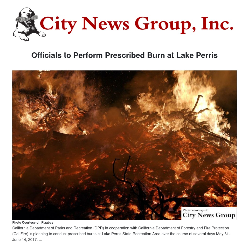 California Department of Parks and Recreation (DPR) in cooperation with California Department of Forestry and Fire Protection (Cal Fire) is planning to conduct prescribed burns at Lake Perris State Recreation Area over the course of several days May 31- June 14, 2017. The actual burn date(s) will be dictated by weather conditions. The vegetation type will be annual grassland. The burn will total close to 600 acres. Smoke will be visible from nearby communities but will disperse quickly and is not expected to be a health hazard.