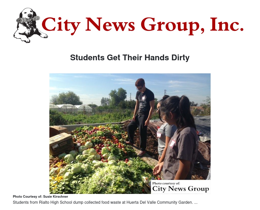 In October and February, students from Rialto High School visited Huerta Del Valle Community Garden, managed by Maria Alonso and Arthur Levine, in Ontario, CA. The students built a rain capture system to collect and recycle rainwater from the room of the HDV’s greenhouse. Students also helped compost a truckload of food waste that HDV collected from sites throughout the community, including schools and local businesses. The students later returned to the site to plant fruit trees and perform an insect inventory to monitor the health of the garden.