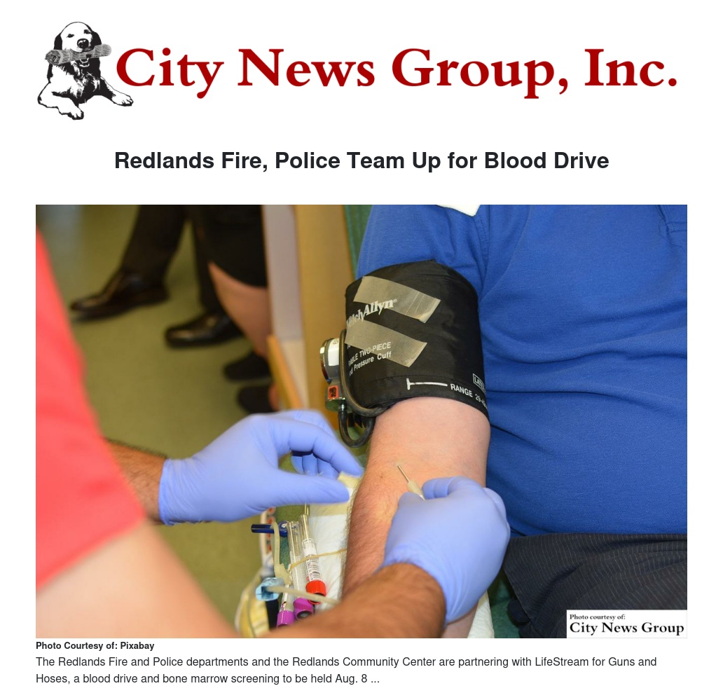 REDLANDS>> The Redlands Fire and Police departments and the Redlands Community Center are partnering with LifeStream for Guns and Hoses, a blood drive and bone marrow screening to be held from 1 to 5 p.m. Aug. 8, at the Community Center, 111 W. Lugonia Ave.