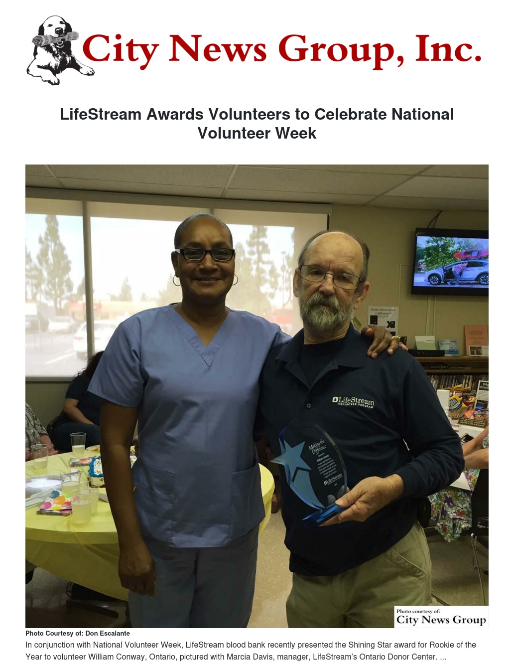 LifeStream blood bank volunteers received Presidential pins for service during 2015 and the Shining Star as “Rookies of the Year” on Monday, April 18 at LifeStream’s San Bernardino Donor Center and Thursday, April 21 at the Ontario Donor Center.