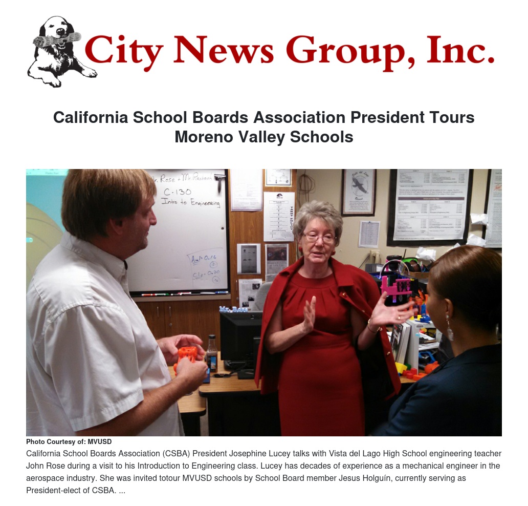 “Moreno Valley Unified is becoming well-known in education circles as a district on the move,” said Lucey. “CSBA recently awarded MVUSD three Golden Bells, our highest honor, for outstanding programs and achievement. Touring the schools, it was clear to me those awards were well-deserved.”