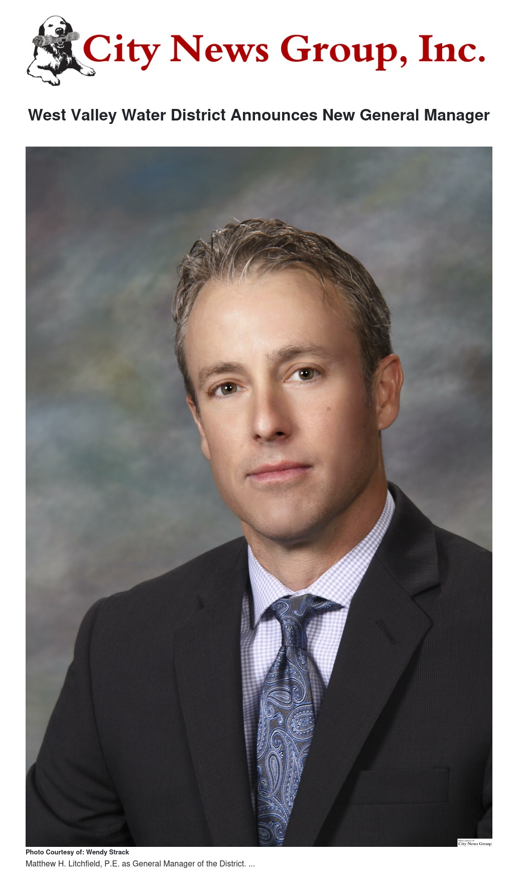 SAN BERNARDINO>> At the November 17, 2016 meeting of the West Valley Water District Board of Directors, an agreement was unanimously approved to formally appoint Matthew H. Litchfield, P.E. as General Manager of the District.