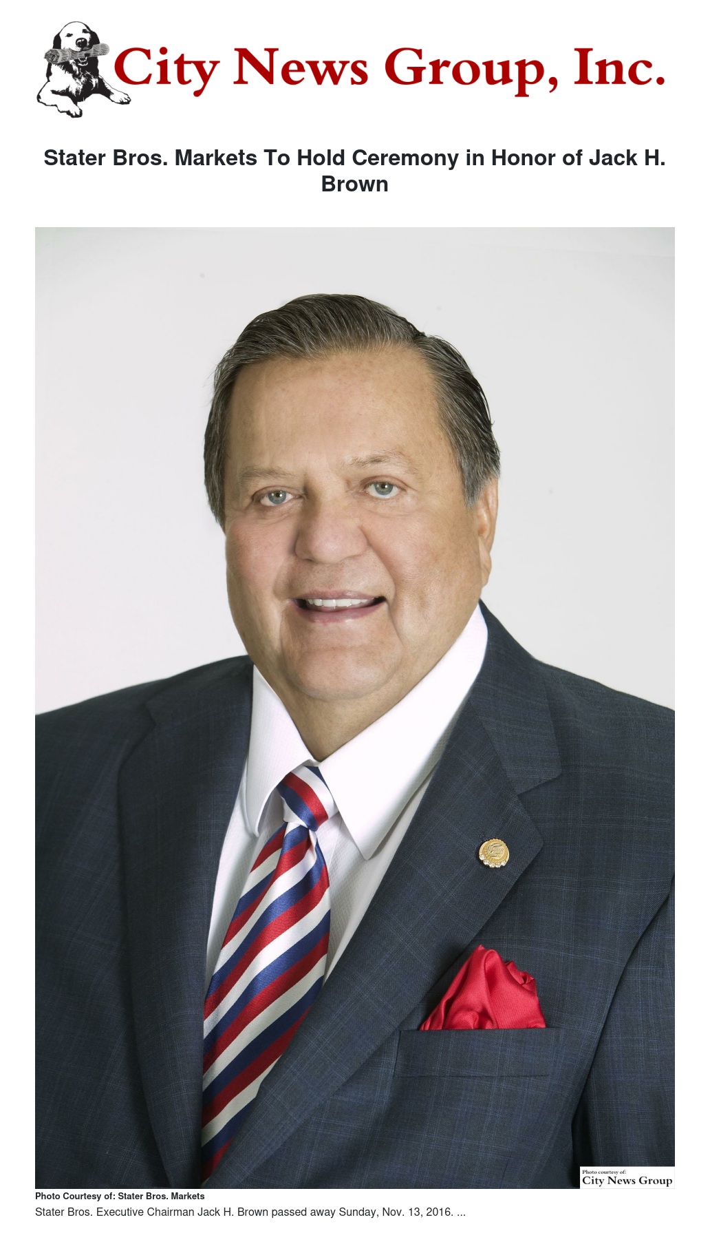 Stater Bros. Markets To Hold Ceremony in Honor of Jack H. Brown