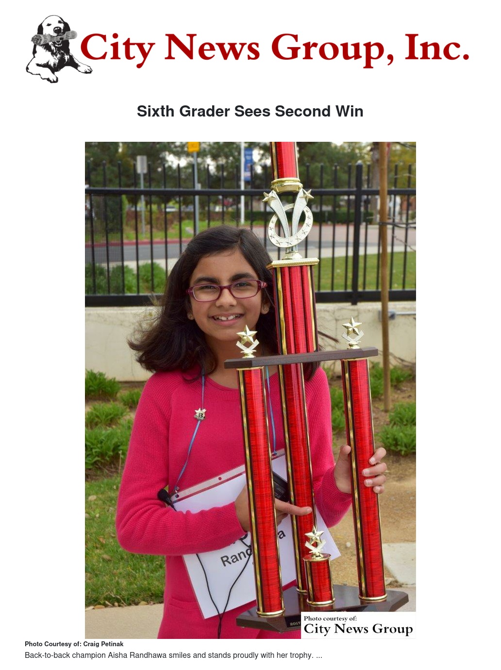 Randhawa will represent Riverside County at the Scripps National Spelling Bee held May 27 through June 2 at the Gaylord National Resort and Convention Center in Maryland. She finished in the top 50 at last year’s national event.