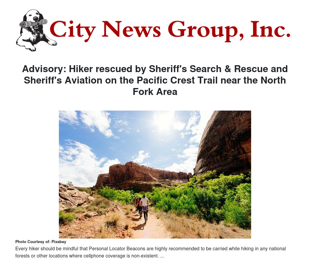 On May 31, 2017 at approximately 4:15 p.m., Sheriff's Volunteer Forces contacted the Aviation Unit regarding a hiker who activated a Personal Locater Beacon (PLB) on Pacific Crest Trail, near the North Fork area. The GPS coordinates from the activation showed the hiker, identified as Jared Lee Ewing, was approximately 6 miles south of Onyx Peak.