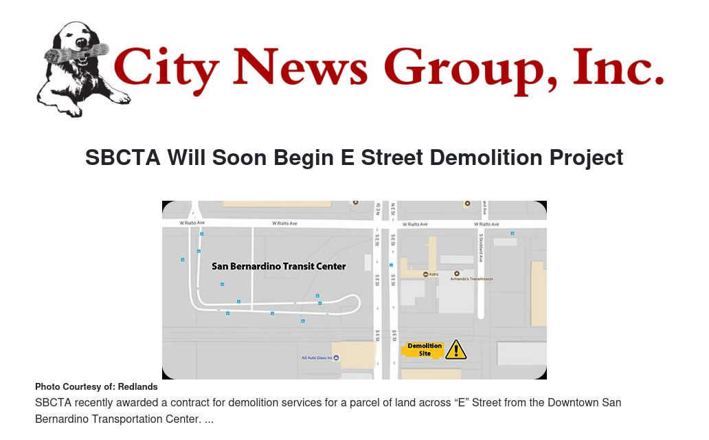REDLANDS>> The San Bernardino County Transportation Authority (SBCTA) recently awarded a contract for demolition services for a parcel of land across “E” Street from the Downtown San Bernardino Transportation Center. The contract is for the demolition of all structures, removal and disposal of all lead based paint and asbestos containing materials, landscaping, shrubs, tree removal, and grading of the parcels for drainage, including import and export of fill materials as needed, and the removal of utilities and utility lines servicing structures scheduled for demolition.