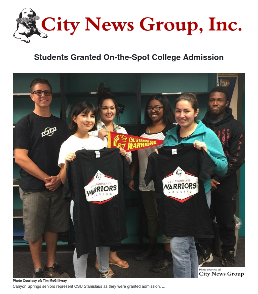 From the “It never hurts to ask” file comes word that several Canyon Springs seniors were granted admission to CSU Stanislaus by a representative who came to the school and personally reviewed the transcripts of interested students. How did this happen?