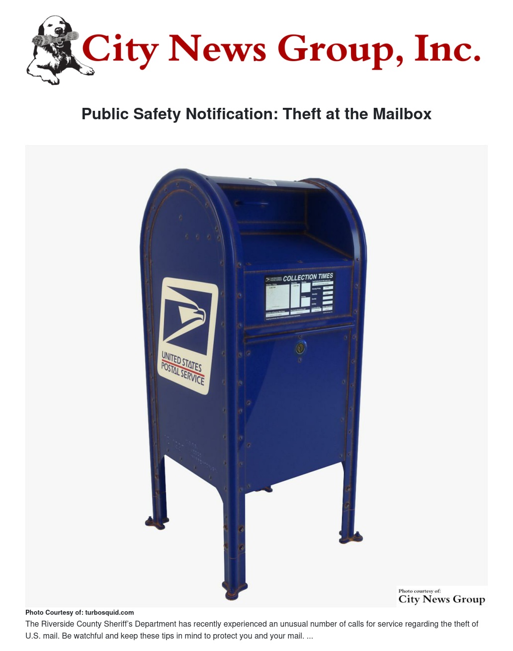 Public Safety Notification: Theft at the Mailbox