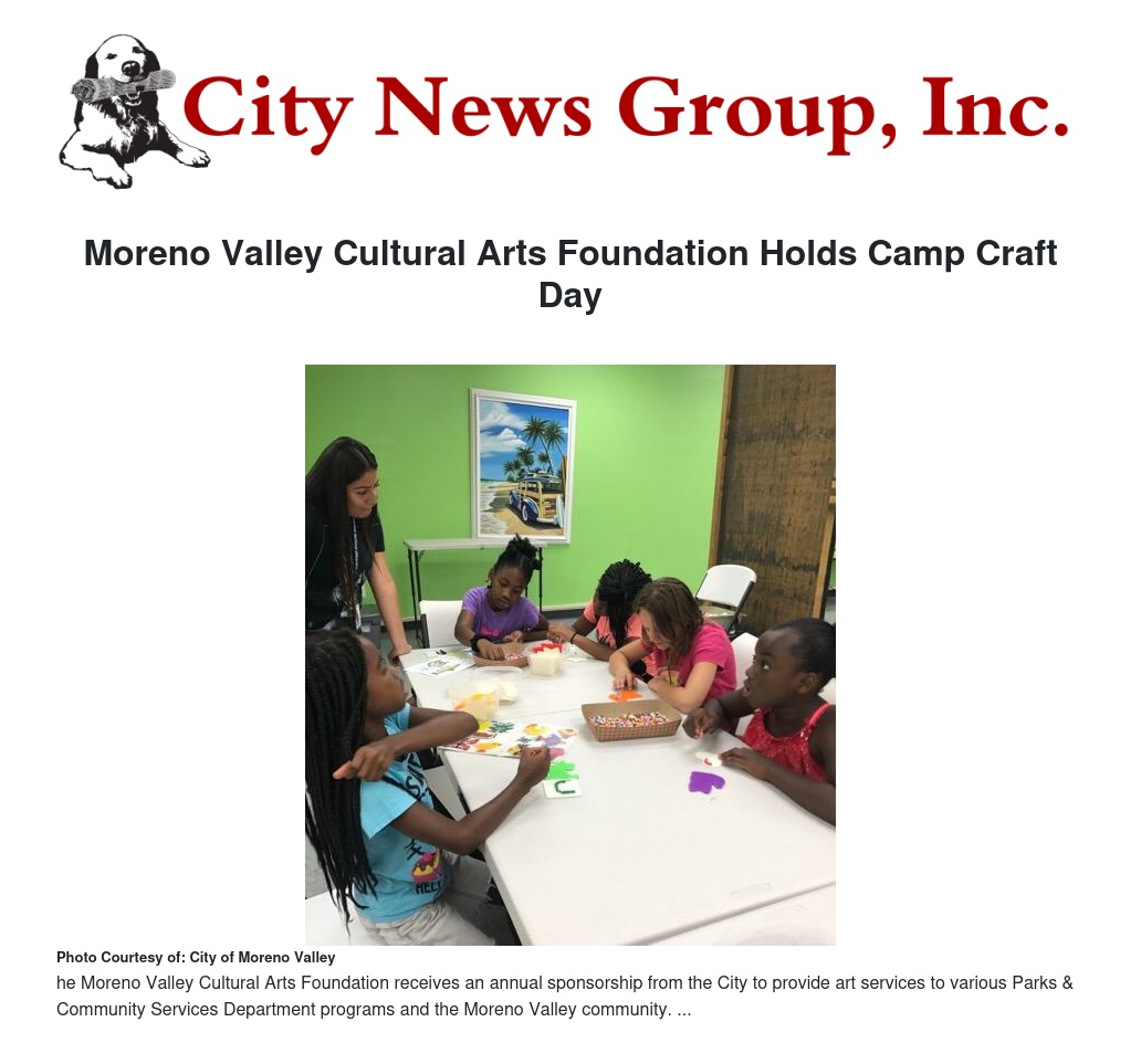 The Moreno Valley Cultural Arts Foundation receives an annual sponsorship from the City to provide art services to various Parks & Community Services Department programs and the Moreno Valley community.