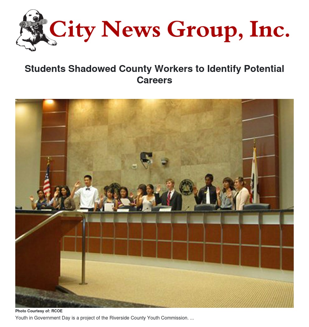 Youth in Government Day was adopted by the Riverside County Youth Commission. Students learn about day-to-day government functions that range from citing code enforcement violators to helping at animal shelters.
