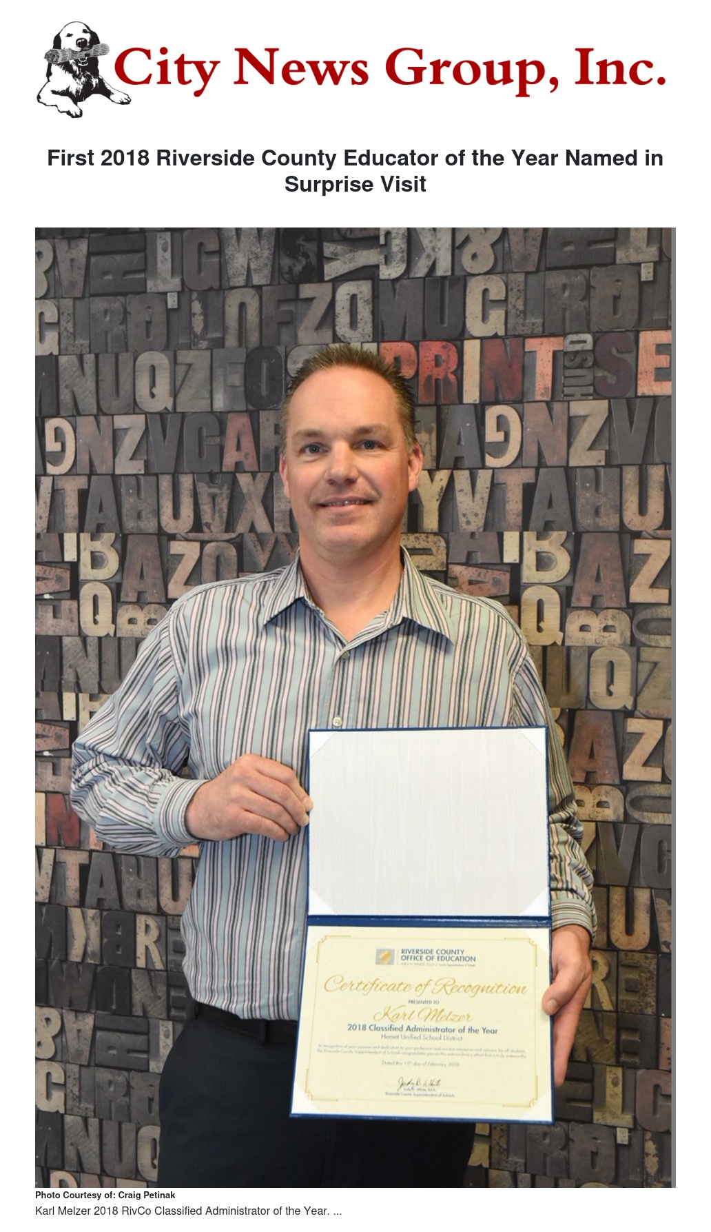 But having an entourage of dignitaries and photographers invade his print shop to surprise him with the 2018 Riverside County Classified Administrator of the Year Award on Thursday was a bit different.