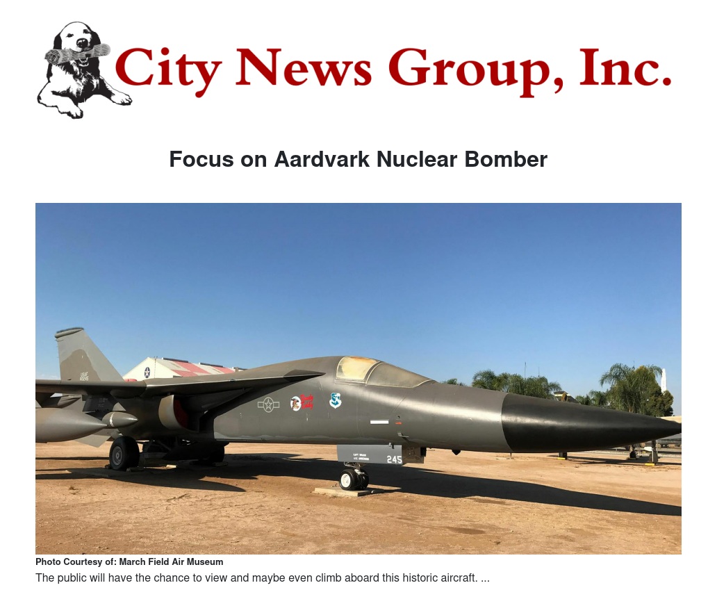 March Field Air Museum is proud to announce the seventh installment of “Up-Close Aircraft Days” on Saturday, July 14, 2018, from 11 a.m. to 3 p.m. As part of this new interpretive program, a different aircraft is featured each month with the next focused on the Fighter-Bomber FB-111A Aardvark. On the second Saturday of each month throughout the year, Museum guests will have the opportunity for a close-up look – sometimes climbing stairs to get a close-up view into the cargo bay or cockpit, other times even climbing aboard.