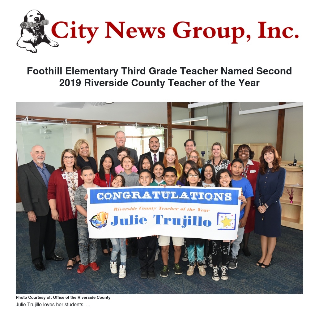 Julie Trujillo describes her third grade classroom at Foothill Elementary School in the Alvord Unified School District as “my little slice of heaven.” On Friday, May 25, a cadre of boisterous supporters, led by Riverside County Superintendent of Schools Dr. Judy D. White, burst into her educational paradise with the news that she has been selected as the second 2019 Riverside County Teacher of the Year.