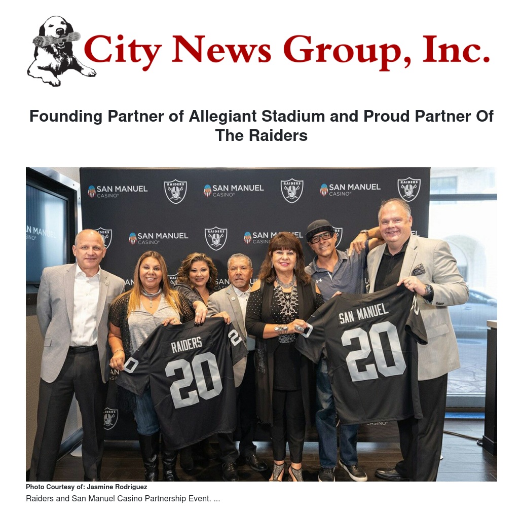 San Manuel Band of Mission Indians announced a partnership with Allegiant Stadium and the Raiders. The partnership designates San Manuel Casino as a Founding Partner of Allegiant Stadium and a proud sponsor of the Raiders starting with the 2020 season.