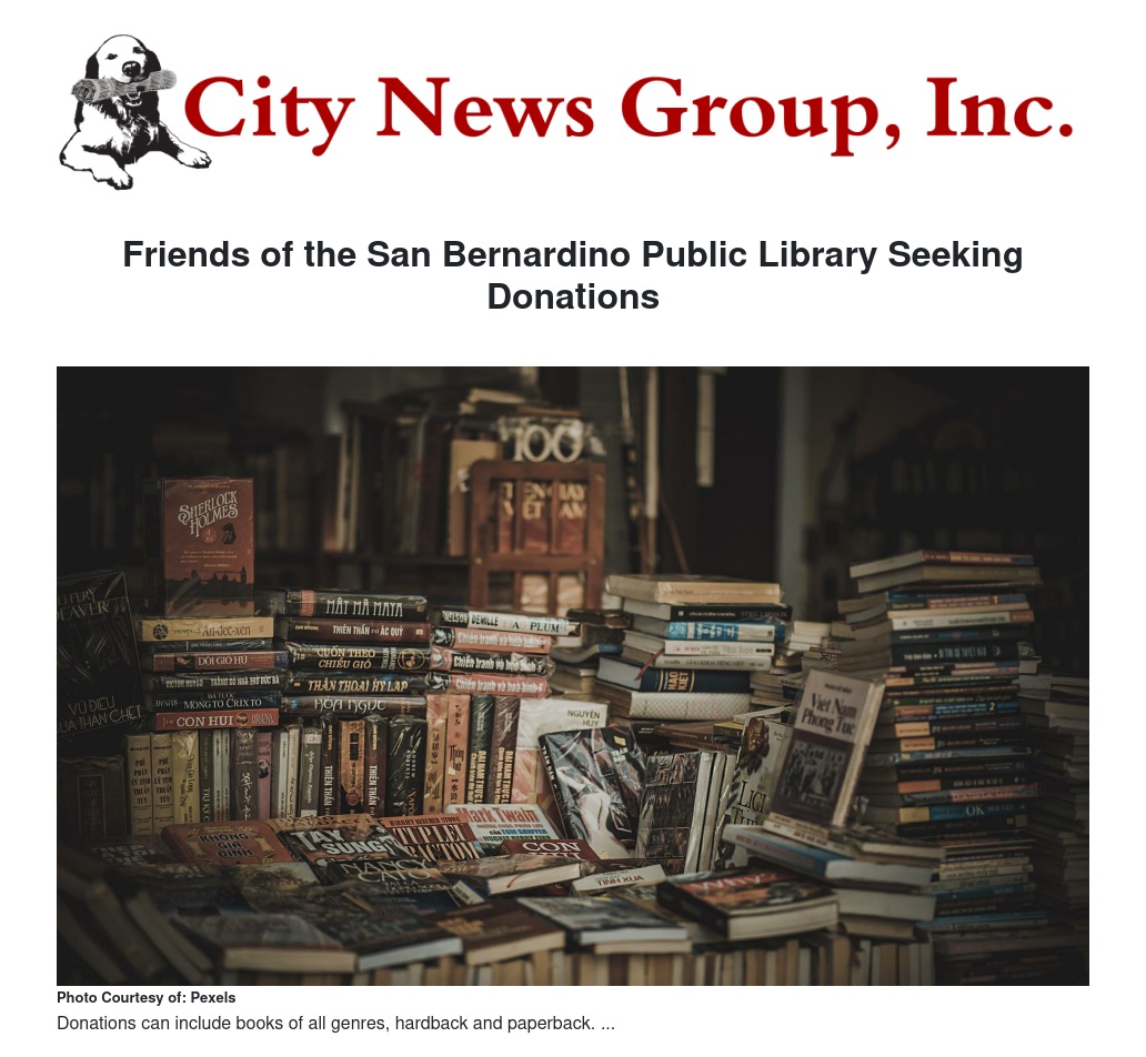 The Friends of the San Bernardino Public Library welcome donations of used books and other materials that are in good condition. The Library staff will evaluate materials for addition to the collection in accordance with the Library Materials Selection Policy. Gift materials that cannot be used in the collection will be given to the Friends for sale in their bookstore, which in turn benefits the Library.
