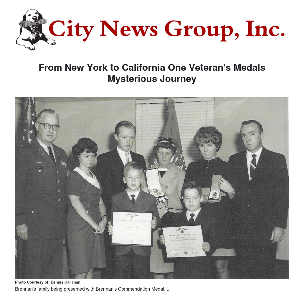 In closing, James J. Brennan’s Service medals were in New York City, New York and somehow mysteriously 50 years later they showed up at a yard sale in San Bernardino, California and no one knows how they got here.