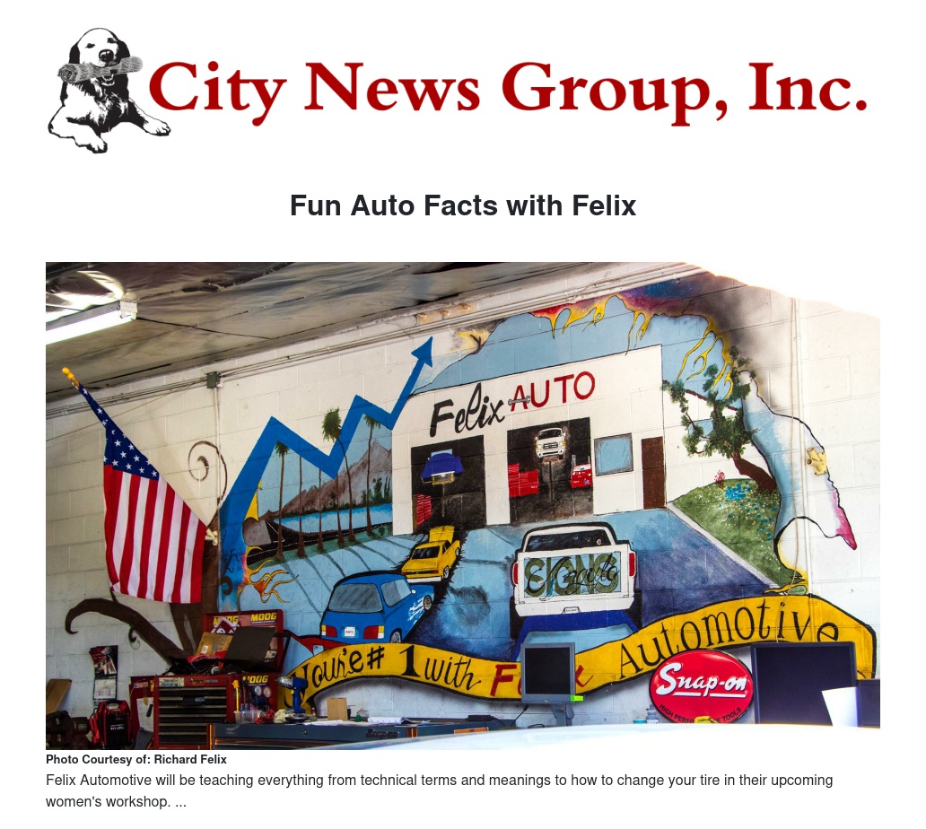 Felix Automotive, located in San Bernardino, is doing something absolutely amazing for women like me. They are putting on a three-part Workshop for Women, teaching us incredibly important automotive skills so that we don’t have to worry as much when we experience potentially dangerous automotive situations. I am beyond excited about this. It is an unfortunate reality that we, as women, sometimes get taken advantage of in stressful situations, like when we take our cars in to get repaired and get overcharged because they think we don’t know any better. This is real. This DOES happen. But because of Felix Automotive, we can gain some independence and some serious knowledge so that this no longer happens.
