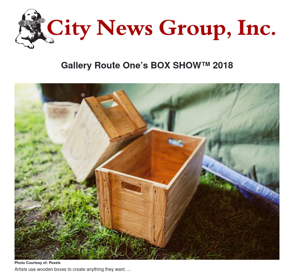 For THE BOX SHOW™, Gallery Route One distributes 150 identically sized wooden boxes to 150 people, some noted artists and some just regular people in the community eager to let their art flags fly. Roughly two months later, each Box Artist’s work of art goes on display at the gallery for seven weeks. Silent bidding for the boxes occurs throughout the exhibition, culminating in the dynamic live auction, this year being held on Sunday, September 30.