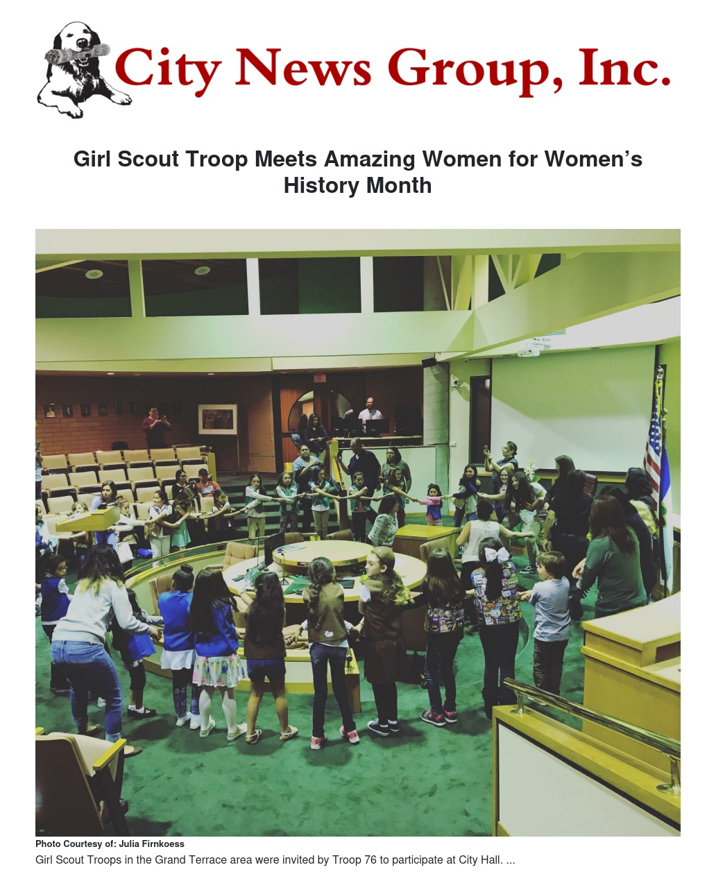 Girl Scout Troop 76 celebrated big this year during Women’s History Month in March by hosting a Women’s Kick off at City Hall on Tuesday, March 6th. Our City Manager, Harold Duffey and Grand Terrace Mayor Darcy McNaboe coordinated a presentation featuring the top Women leaders affiliated with the City of Grand Terrace. Speakers were Mayor Darcy McNaboe, Cynthia Fortune, Assistant City Manager & Finance Director; Sandra Molina, Planning & Development Director; Debra Thomas, City Clerk; Adreane Freeman, Management Analyst; Sylvia Beasley, Sheriff’s Service Specialist. The women spoke about their roles with the City of Grand Terrace and inspired our Girl Scouts to reach for the Stars, emphasizing that with determination they can do anything.