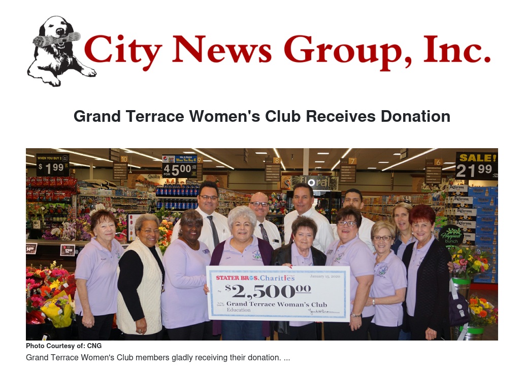 To further the celebration, Stater Bros. Charities has invested in the Grand Terrace Women’s Club, a local nonprofit organization that is making a positive impact in the community. The Grand Terrace Woman's Club has been selected for a $2,500 donation in support of their ongoing efforts, which came highly recommended by store manager, Jeff Andrusak, “We chose the Grand Terrace Women’s Club because of all the good they do for the community. It is always to benefit children and education and they are a big part of the community,” commented Andrusak. Debbi Earle, President of the Grand Terrace Women’s Club was on hand along with a host of members to receive the check. “We are elated to get this money, this is wonderful, and it will go to great cause. We have scholarships and we also give to the library,” Earle said.