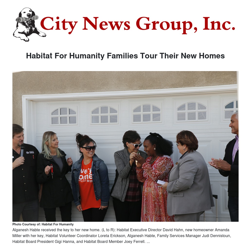 On Saturday, November 17, Habitat For Humanity San Bernardino Area hosted a Home Dedication ceremony for two new homes in Grand Terrace. Alganesh Habte and Amanda Miller and their respective family members, were able to walk through their completed homes for the first time, after patiently waiting many years for this day to come. These are the first Habitat homes built in the greater San Bernardino area in over three years. Alganesh, her daughter Senait Woldernarium and Alganesh’s two grandchildren, will reside at 12569 Michigan Street, and Amanda and her four children will reside at 12579 Michigan Street. 60 guests attended the event, which included elected officials, community leaders, Habitat Board members and Donors, and extended family members and friends. Special music was provided by the Redlands-based A Capella group Rhymes With Orange. Speakers included Al Arguello, Bank of America Inland Empire Market President, and Riverside Habitat Executive Director Kathy Michalak, who read a letter from Grand Terrace Mayor Darcy McNaboe. Due to a prior engagement, Mayor McNaboe was not able to attend, but in the letter, she congratulated both families, whom she had the opportunity to work side-by-side with, painting and pounding nails. She also thanked Habitat for keeping their promise to build these homes. Both families were given a basket of Proctor & Gamble household products, which also included $100 gift cards to Home Depot and Stater Brothers. A surprise announcement came from Kate Thibault from GRID Alternatives, who shared that each home will receive free solar panels next April, to coincide with Earth Day, 2019.