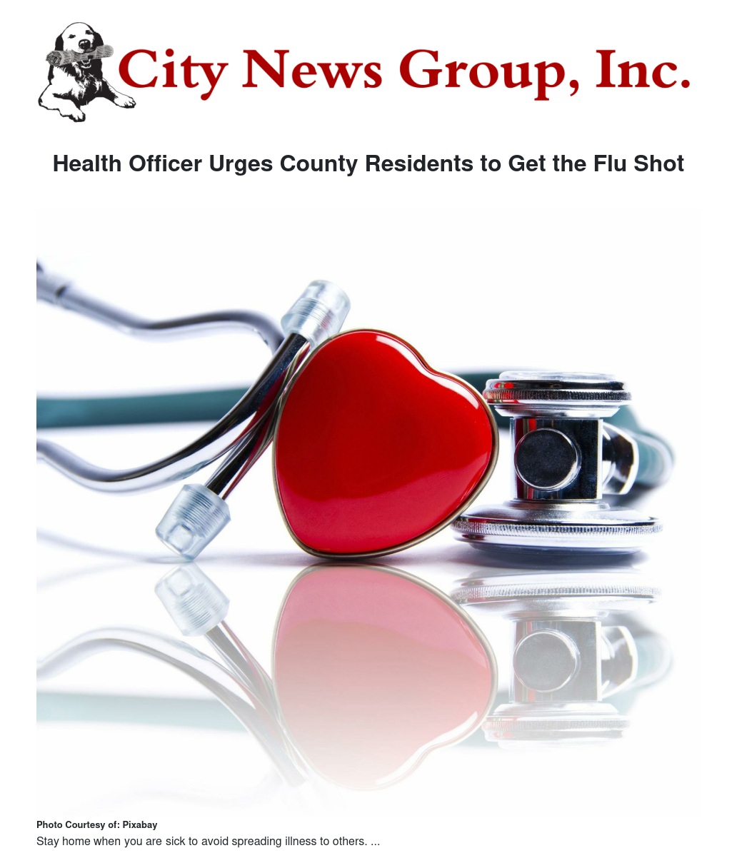 The Public Health Officer is strongly encouraging County residents to get the flu shot. Initial influenza reports have sharply increased nearly 300% in the last week, going from 38 reports to 150 reports. Within the last two weeks, the County has also confirmed three (3) flu-related deaths.