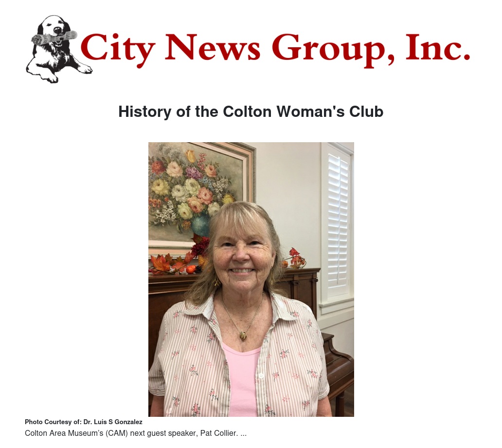 On Saturday, Oct 12, at 2:30pm, the Colton Area Museum’s (CAM) guest speaker program will feature Pat Collier, a fourth generation “Coltonite” and long time member of the Colton Woman’s Club. With many stories to share, and background information to fill our curiosity, Pat Collier will present a historical timeline of the organization’s development and highlight some of the important milestones dating back to the beginning of the 20th Century.