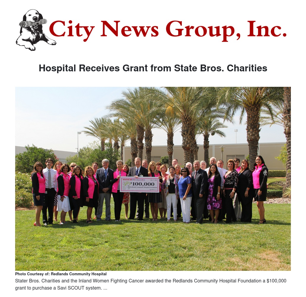 Stater Bros. Charities and the Inland Women Fighting Cancer (IWFC) awarded the Redlands Community Hospital Foundation (RCHF) a $100,000 grant to purchase a Savi SCOUT system, a wire-free breast localization system to improve breast cancer biopsy and lumpectomies for patients.