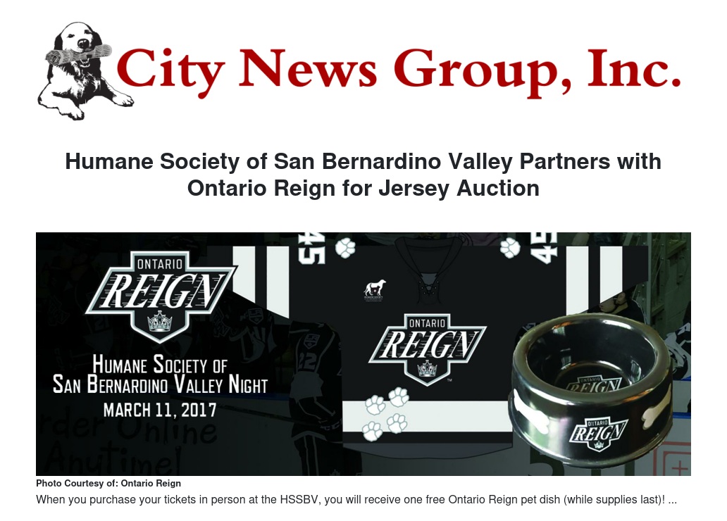 The Ontario Reign, proud AHL affiliate of the 2012 & 2014 Stanley Cup Champion Los Angeles Kings will take the ice against the San Antonio Rampage while wearing jerseys designed for the Humane Society of San Bernardino Valley. The jerseys will be auctioned off the players’ back immediately following the game. The proceeds from the jersey auction will benefit the Humane Society of San Bernardino Valley.