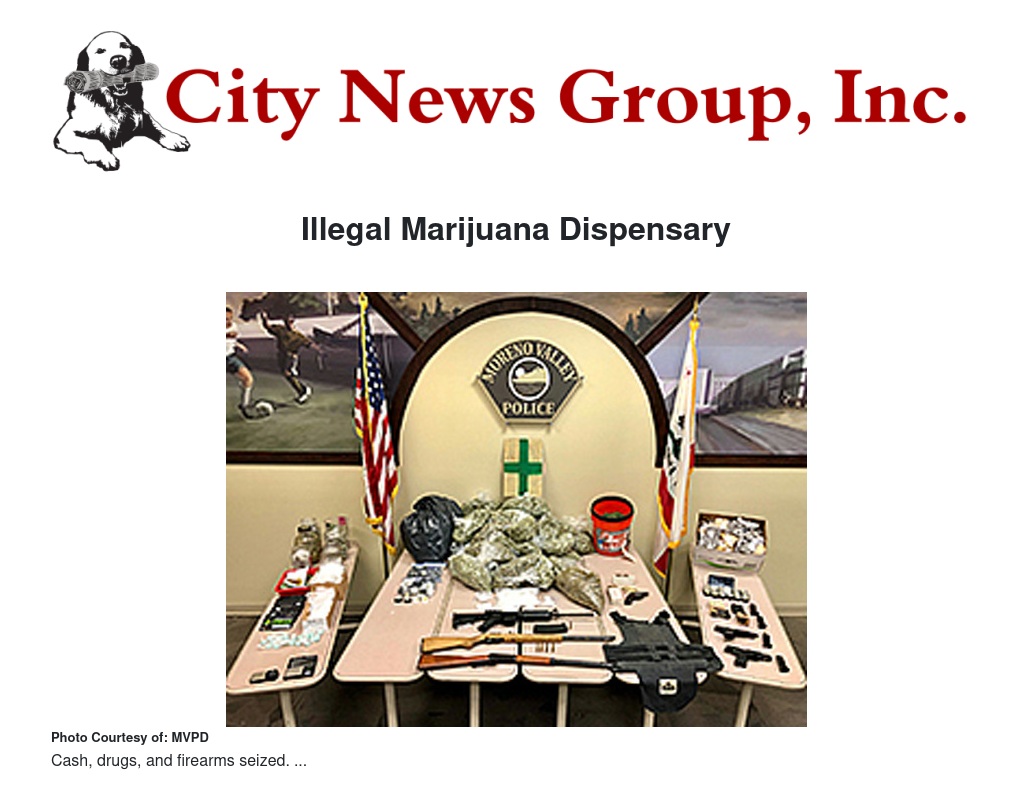 On May 30, 2018, officers assigned to the Moreno Valley Police Department Special Enforcement Team concluded a lengthy investigation into an illegal marijuana dispensary operating in the 24400 block of Sunnymead Boulevard in the city of Moreno Valley. Search warrants were executed at the location as well as a related residence in the 6500 block of Balzac Circle in the city of Riverside.