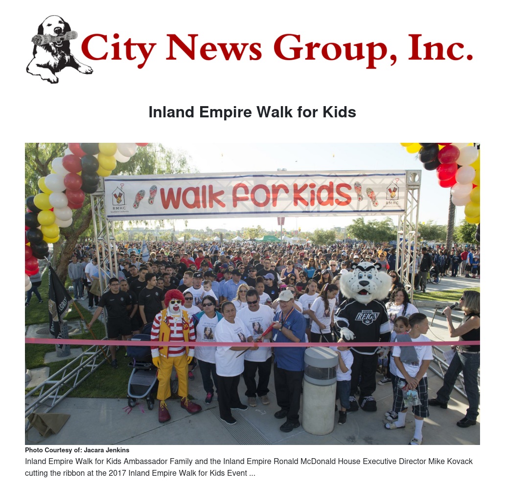 Inland Empire residents and Ronald McDonald House Charities of Southern California (RMHCSC) will lace up their shoes on April 8th and join together in support of critically ill children and their families at the annual Inland Empire Walk for Kids, a fun, family-friendly 5k (3.1 miles) event that raises funds for the life-changing services provided by the Inland Empire Ronald McDonald House. With a fundraising goal of $250K, 100 percent of the money raised goes directly to serving local families right here in the community, continuing its mission to provide a “home away from home” when it’s needed most – enabling families to stay near their hospitalized child at little to no cost. No eligible family is ever turned away due to inability to pay.