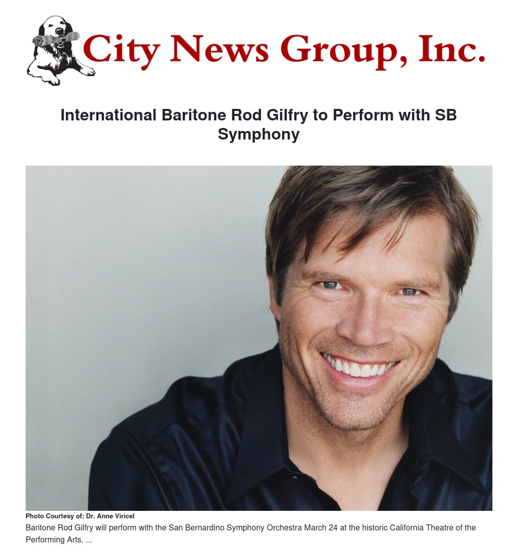 Following his performance with the San Bernardino Symphony Orchestra, Gilfry will be performing with the Phoenix Symphony, Los Angeles Opera, Santa Fe Opera, San Francisco Opera, Metropolitan Opera, and in Seoul, Korea. In addition to his performance work, Rod Gilfry is an Associate Professor of Vocal Arts at the University of Southern California Thornton School of Music in Los Angeles.