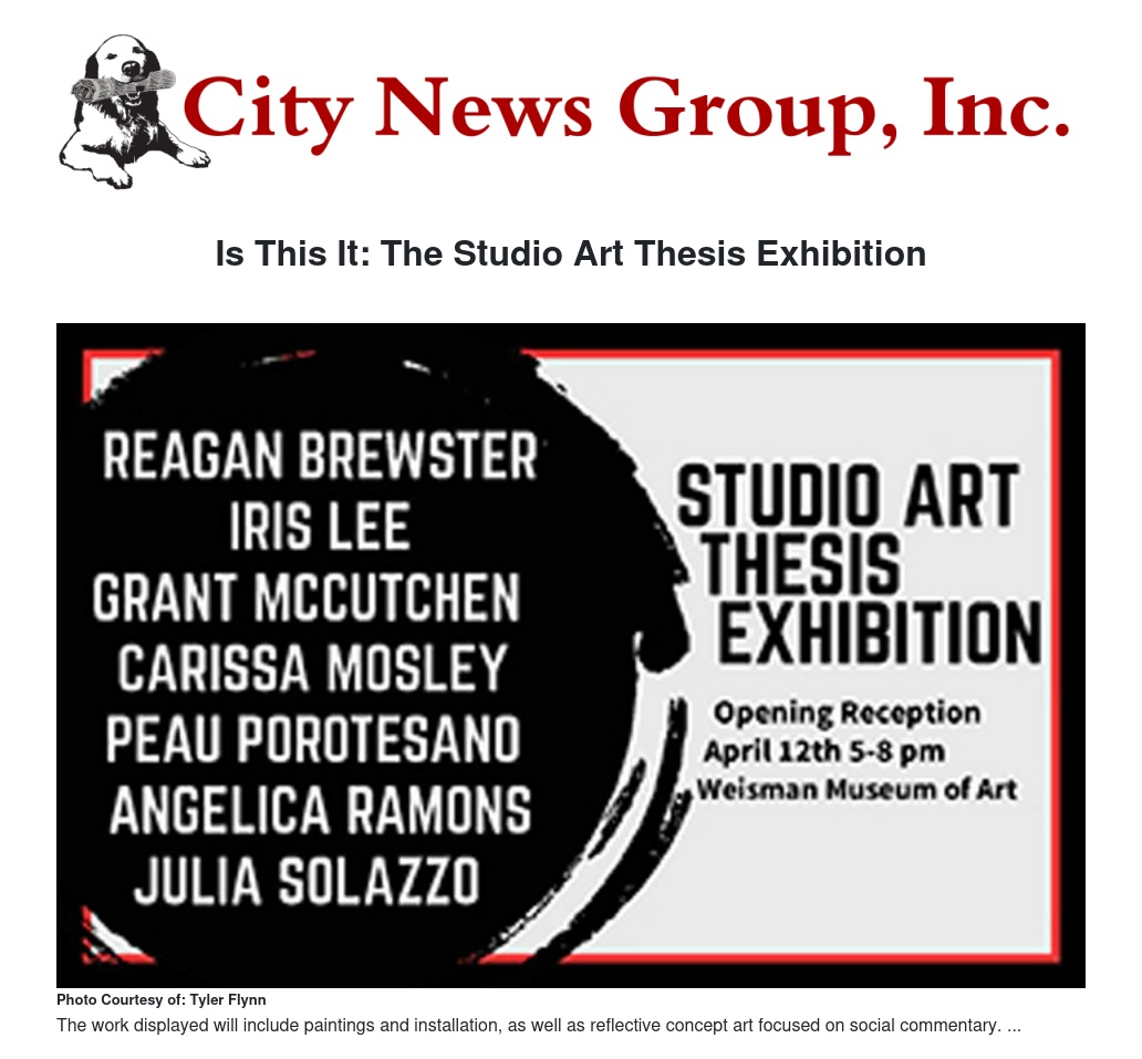 The Frederick R. Weisman Museum of Art at Pepperdine University will exhibit Is This It: The Studio Art Thesis Exhibition from Thursday, April 12 through Saturday, April 28, 2018. Is This It will feature works by seven artists who are graduating from Pepperdine’s Seaver College with BA degrees in Studio Art. There will be a public reception to meet the artists on Thursday, April 12 from 5-8 p.m. The student artists include Reagen Brewster, Grant McCutchen, Iris Lee, Carissa Mosley, Peau Porotesano, Angelica Ramos, and Julia Solazzo.