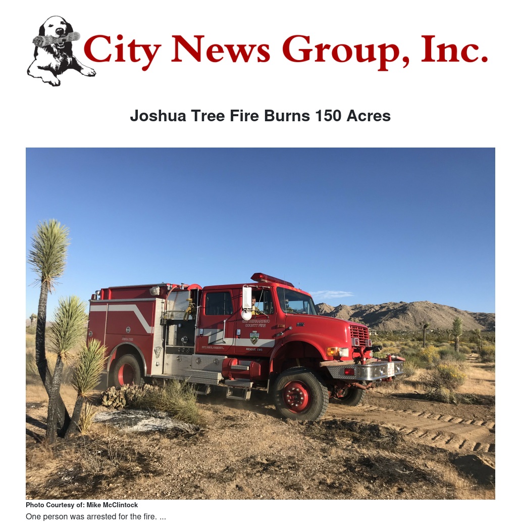 At 11:27am on May 11, 2020, San Bernardino County Fire crews were dispatched to a reported vegetation fire in the area of 29 Palms Highway & La Contenta Road in Joshua Tree. Units arrived in the area within six minutes to find smoke showing from a large plot of land Southeast of the intersection.