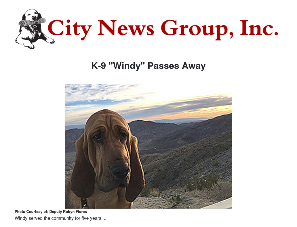 K-9 Windy, for those who don’t know, was a human-tracking bloodhound with the Riverside County Sheriff’s Department who has only been retired for a couple of weeks due to complications that arose from her illness.