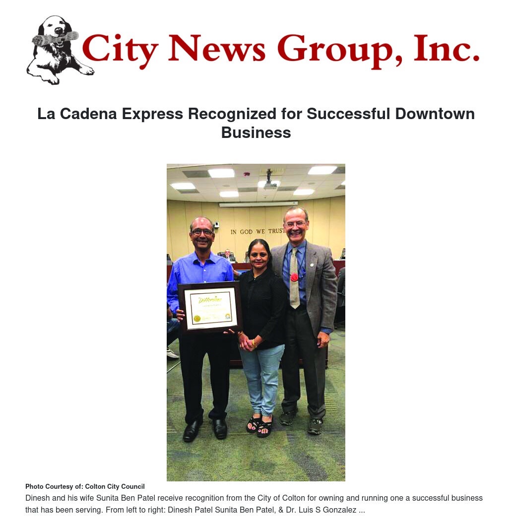 At the recent Colton City Council meeting, Council Member Dr.G (Dr. Luis S Gonzalez) presented La Cadena Express with a “Business Focus” recognition award for its successful business operation in the City of Colton. This well-known establishment is owned and operated by Dinesh and Sunita Ben Patel, and is truly one of Colton’s amazing success stories.