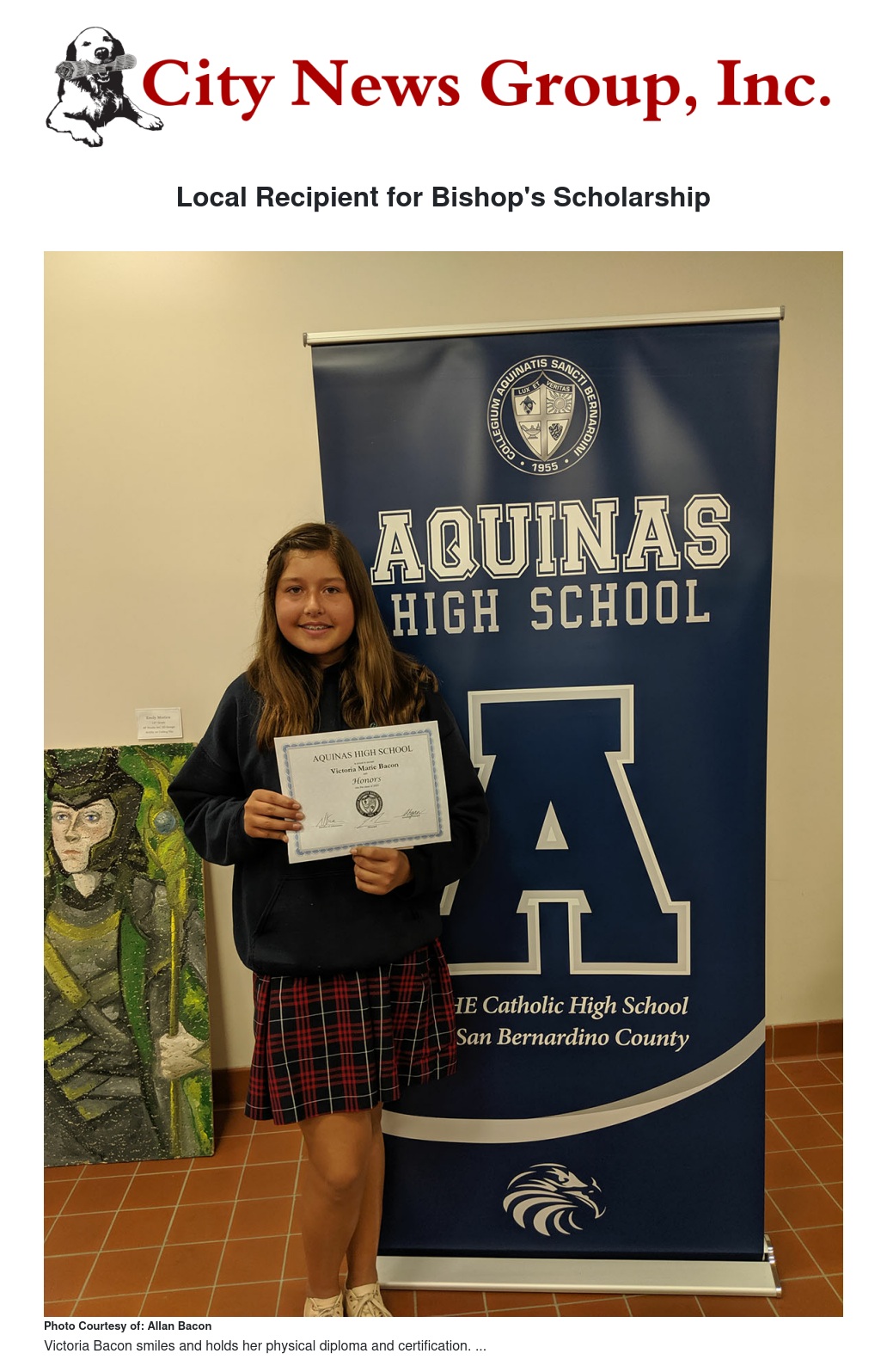 Victoria Bacon, recently graduated from Sacred Heart Academy (SHA) in Redlands. She received the Bishop's Scholarship, a competitive award that is given to a student attending a Catholic school in the San Bernardino Diocese who will attend a Catholic High School. Her scholarship will pay for her tuition throughout her four years at Aquinas High School.