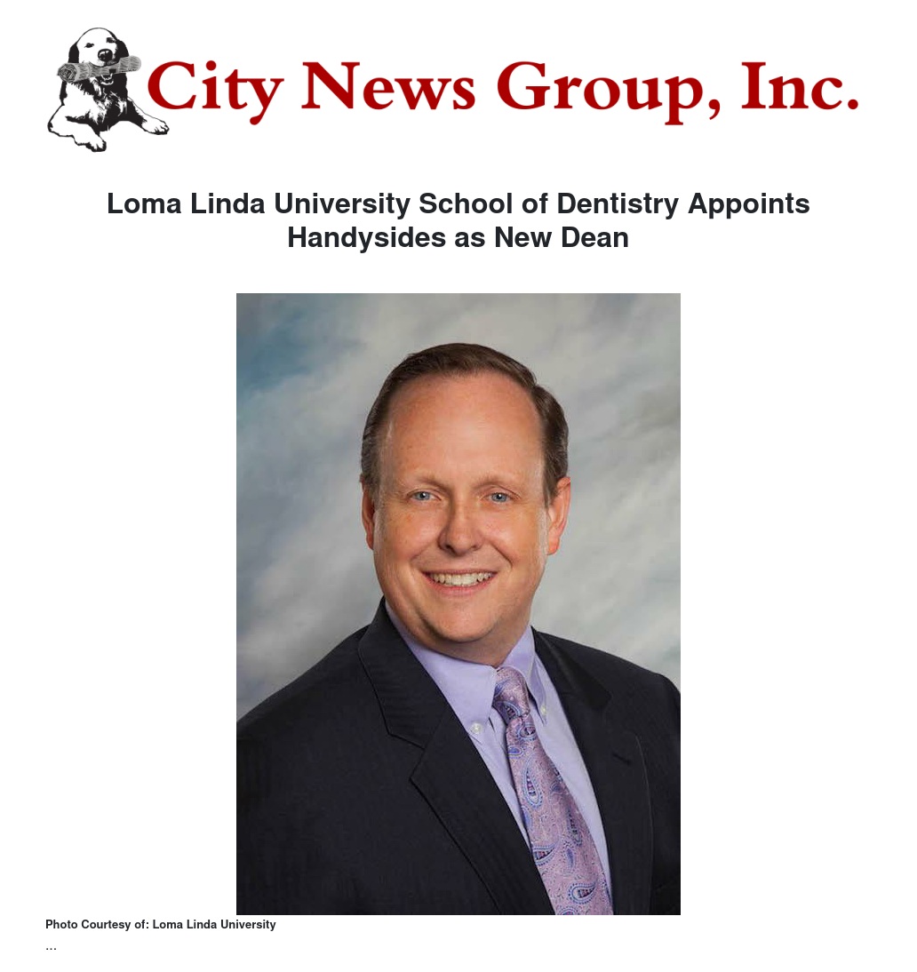 LOMA LINDA -- Loma Linda University (LLU) School of Dentistry has named Robert Handysides, DDS, its new dean, effective Jan. 1, 2018. Handysides currently serves as the school’s associate dean for academic affairs.