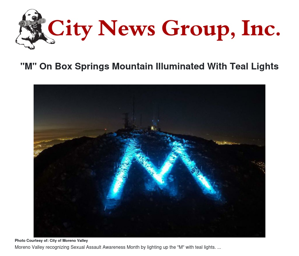 The "M" on Box Springs Mountain was illuminated with teal lights from dusk until midnight on April 10th in recognition of Sexual Assault Awareness Month, which is held every April. This year's theme is "Embrace Your Voice" to inform individuals on how they can use their words to promote safety, respect, and equality to stop sexual violence before it happens.