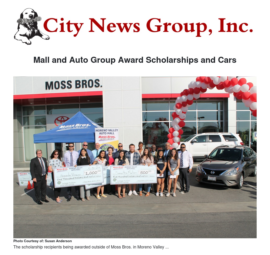 The scholarship was open to all seniors at the four comprehensive high schools in the Moreno Valley Unified School District. To compete, students participated in a five week Instagram photo challenge. The scholarship recipients were selected based on creativity and fan engagement. Dezi Vera was selected to win the vehicle in a random drawing of all finalists. Moss Bros. Auto Group and the Moreno Valley Auto Mall wishes all students continued success throughout your college career and beyond.