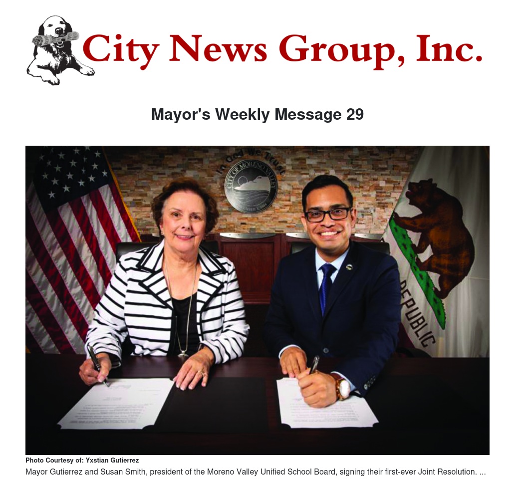 Monday, the City of Moreno Valley and the Moreno Valley Unified School District signed their first-ever Joint Resolution today, establishing another first: a collaborative program to provide invaluable work experience to the City's most vulnerable youth.